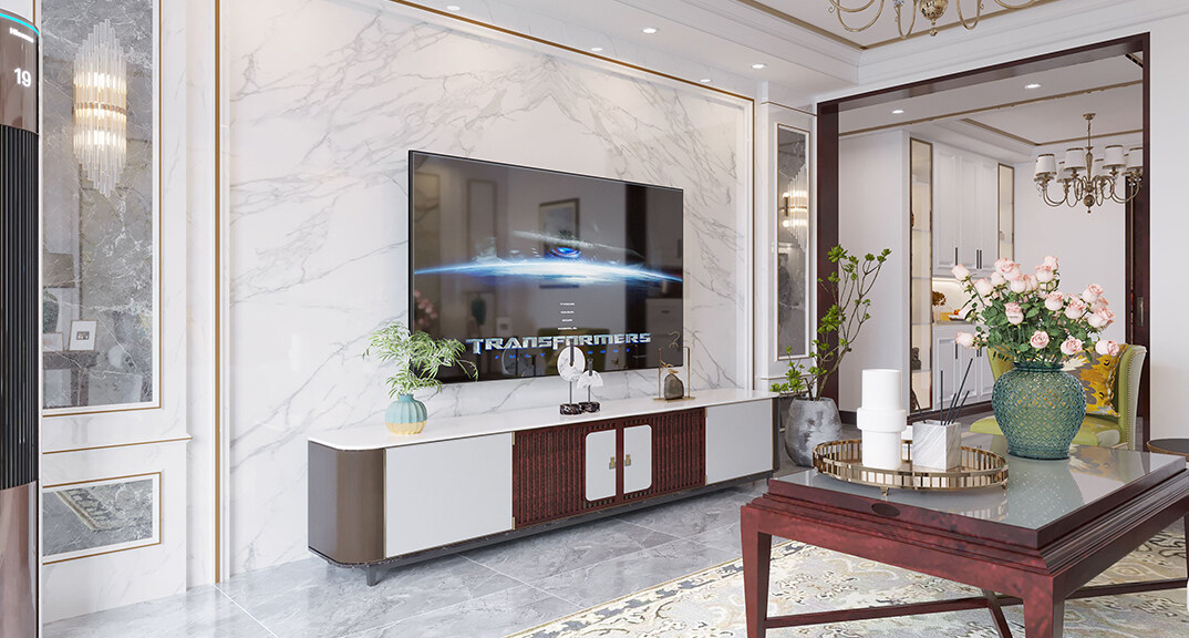 客廳采用簡潔的石膏裝飾線條吊頂,搭配精致的吊燈,營造出一種浪漫的感覺。以大理石作為電視背景墻和地面裝飾材料,光澤感極佳,在沙發(fā)區(qū)鋪上大幅棕灰色地毯,使空間區(qū)域劃分更加清晰。沙發(fā)運用灰色調與地面顏色相呼應,拉大了空間感,搭配白色的墻面,襯托出獨具一格的知性魅力。