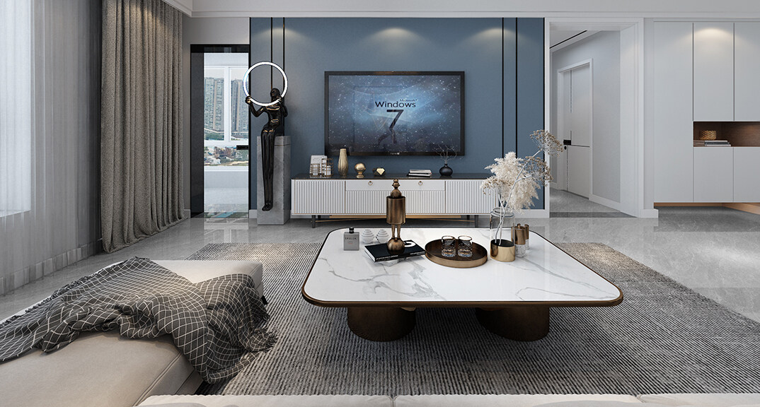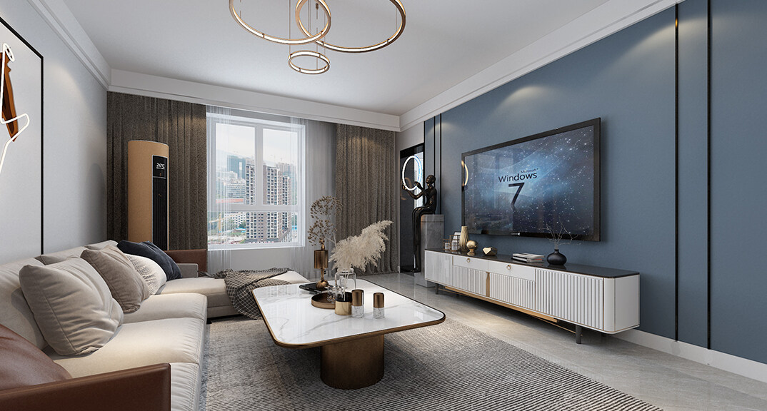 磊鑫伊頓陽(yáng)光125㎡三室二廳客廳電視輕奢風(fēng)格裝修案例效果圖