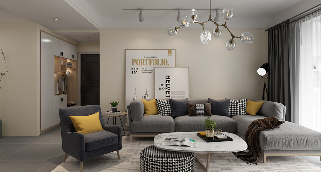 永利國際134㎡三室兩廳客廳沙發(fā)北歐風(fēng)格裝修案例效果圖