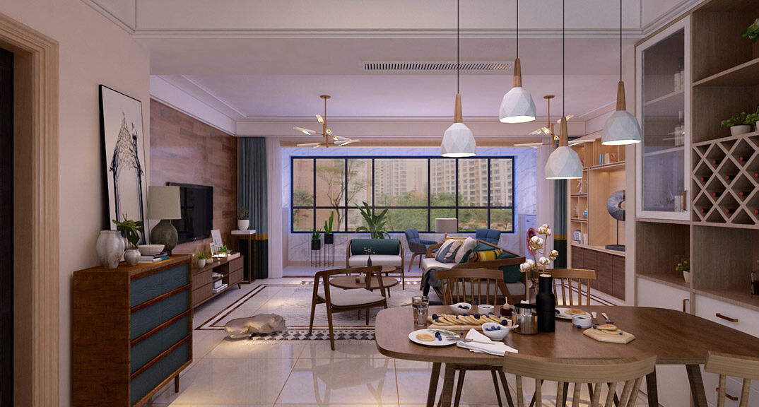 龍湖悠山郡300㎡別墅客餐廳美式風(fēng)格裝修案例效果圖